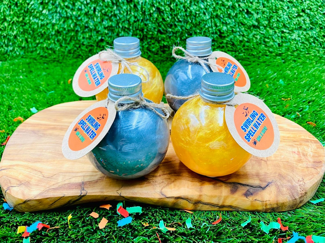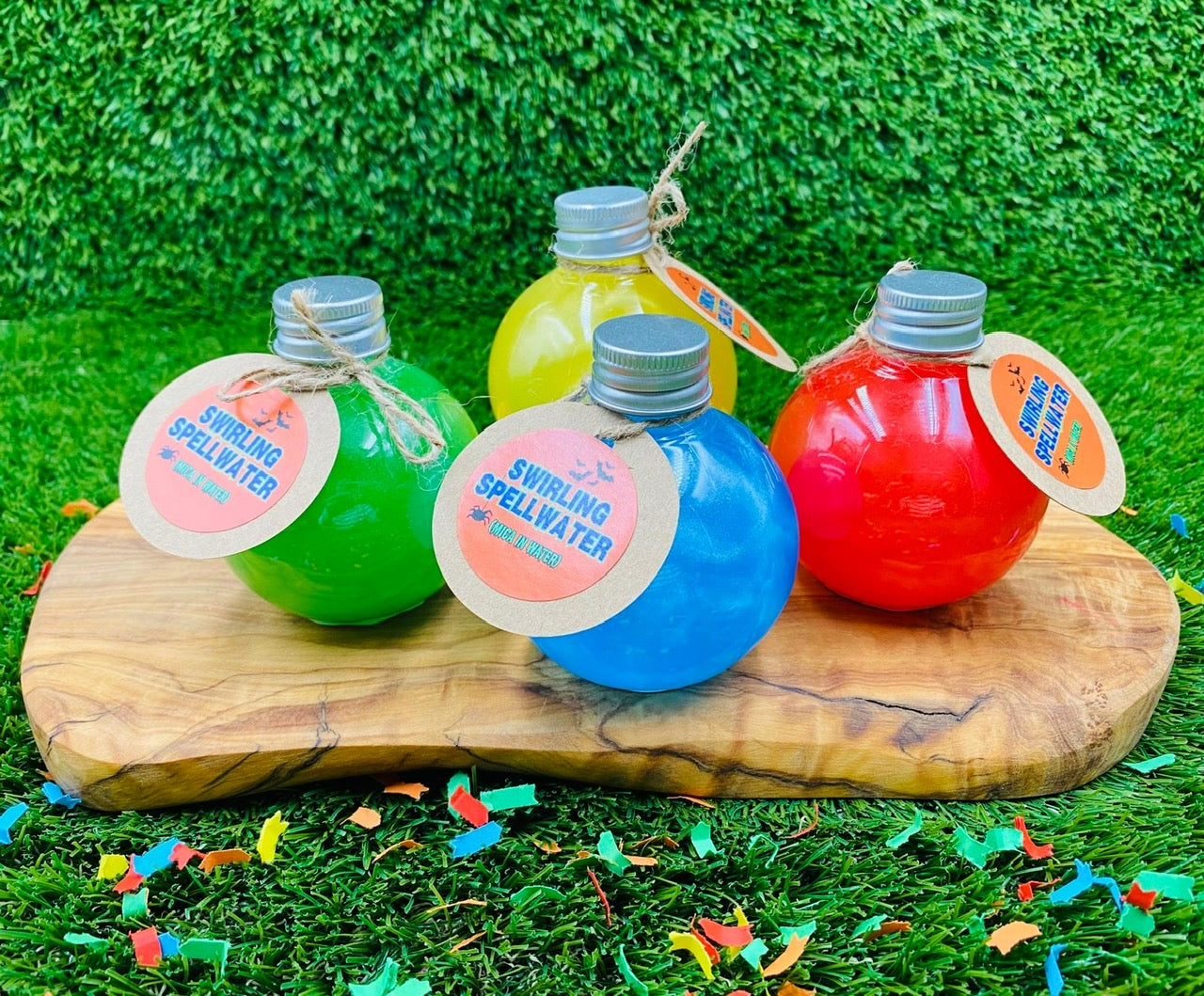 If you love our Swirling Spellwaters but are wanting to be more budget-conscious, welcome to our Wonky Spellwaters! In the spirit of zero waste, we are using up our dented potion bottles (scroll to the last photo to see an example of the dents in the bottles) and adding a beautiful swirly mica water to them. They come in sets of 4 - use the drop down menu to choose yours! The perfect addition to potion play and the bottle can be re-used again and again!
